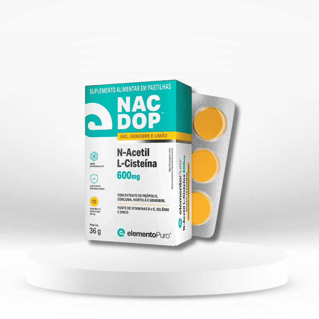 NACDOP é um suplemento alimentar em pastilhas saborosas de mel com extratos naturais de gengibre e limão. Foi desenvolvido especialmente para apoiar a saúde respiratória, imunológica e o bem-estar no dia a dia, combinando os benefícios da N-acetilcisteína com ingredientes tradicionais.