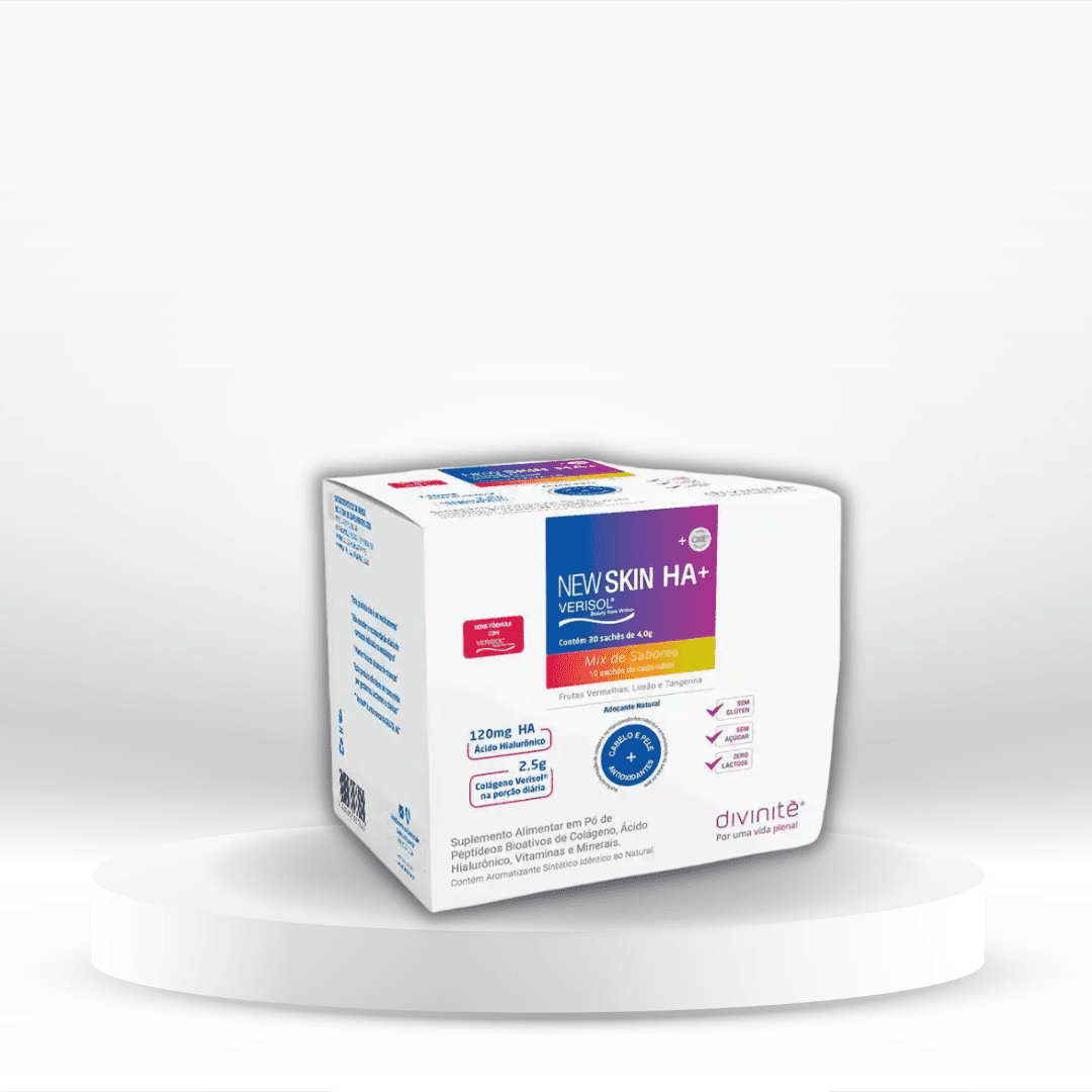New Skin HA+ é um suplemento de alta tecnologia que combina o poderoso Ácido Hialurônico com os Peptídeos Bioativos de Colágeno Verisol®, aliados a vitaminas e minerais essenciais para a saúde da pele, cabelos e unhas.